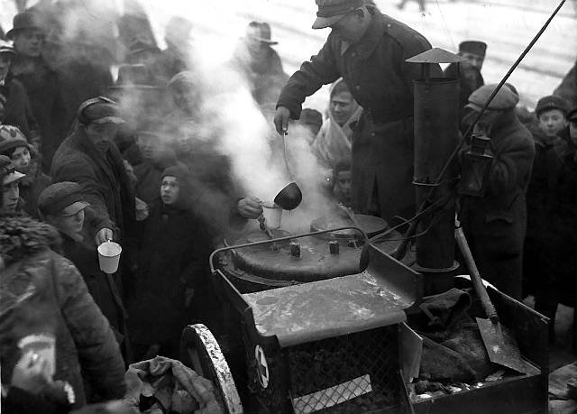 Бесплатный суп только для голодающих детей, сельская местность, США, 30-е С начала 30-х благотворительные организации в крупных городах начали раздачу бесплатного супа для отчаявшихся. Очередь за ним нередко растягивалась на километры, хватало далеко не всем. Часто эти бесплатные столовые были единственным, что спасало людей от голодной смерти. Суп раздавали далеко не только из человеколюбия – вскоре выяснилось, что дать человеку тарелку супа проще, чем получить проблемы, когда отчаявшийся человек пойдёт грабить или воровать.