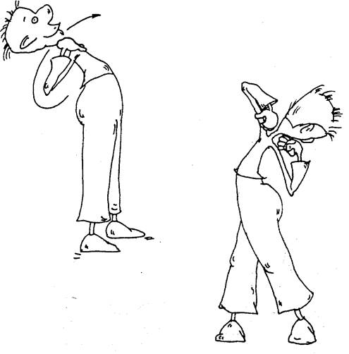 Упражнение № 2 Ноги шире плеч, стопы “приклеены” к полу параллельно друг другу, корпус наклонен вперед под углом 45°, спина прямая, руки на надплечьях. Начинаем поворот туловища вокруг неподвижного позвоночника вправо: глаза, голова, шея, плечи, грудь разворачиваются к потолку, при этом локоть правой руки “смотрит” вверх. Чередование напряжения и легкого расслабления позволяет постепенно увеличить угол поворота. Выполнив несколько таких чередований, плавно и медленно возвращаемся в исходное положение. Только после этого Вы можете выпрямить корпус! Так же делаем упражнение влево. Упражнение № 3 Ноги шире плеч, стопы “приклеены” к полу параллельно друг другу. Спина прямая, отклонена назад, голова на одной линии с позвоночником, подбородок направлен к груди, руки на надплечьях. Упражнение выполняется аналогично предыдущему, но при повороте корпуса вправо ведущий локоть устремляется вниз, а глаза смотрят через плечо на левую пятку. При выполнении скрутки с наклоном назад в левую сторону смотрим через плечо на правую пятку.