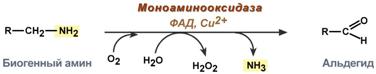 Реакции синтеза дофамина Физиологические эффекты Является медиатором дофаминовых рецепторов в подкорковых образованиях ЦНС, в больших дозах расширяет сосуды сердца, стимулирует частоту и силу сердечных сокращений, расширяет сосуды почек, увеличивая диурез. Обезвреживание биогенных аминов Существуют два типа реакций инактивация биогенных аминов – дезаминирование и метилирование. Дезаминирование протекает с образованием свободного аммиака и с участием ФАД. Катализирует реакцию моноаминоксидаза, она обнаружена во многих тканях, но наиболее активна в печени, желудке, почках, кишечнике, нервной ткани.