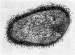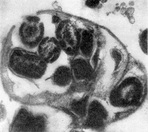 Рис. 25. Клетка бактерии-хозяина (Tuberoidobacter sp.), заполненная размножившимися паразитами. Электронная микрофотография. Увел. ×40000. Процессы атаки, внедрения паразита внутрь клеток-хозяев протекают очень быстро. Спустя 2-3 мин после атаки клетки-паразиты внедряются в клетки-хозяев. По истечении 10- 60 мин они полностью проникают в хозяев, а через 3-5 ч, завершив разрушение атакованных ими клеток-хозяев, паразиты освобождаются из разрушенных клеток. Инфицированная паразитом клетка уже вскоре после атаки подвергается большим структурным изменениям, что связано в первую очередь с нарушением целостности и прочности клеточной стенки. Изменяются контуры клетки — возникают шаровидные сферопласты. Вслед за стенкой идет разрушение содержимого клеток. Наряду с паразитическими формами Bdellovibrio возникают сапрофитные, образующие желтый пигмент. Е. Н. Мишустину и Э. С. Никитиной удалось доказать, что часть паразитов, выбравшись из обломков разрушенной ими клетки-хозяина, переходит не к сапрофитному способу питания, а в состояние покоя, образуя цисты. Это овальные, почти круглые клетки с уплотненной ядерной зоной и толстой оболочкой. Размеры их необычайно малы, и они оставались не замеченными многими микробиологами (рис. 26).