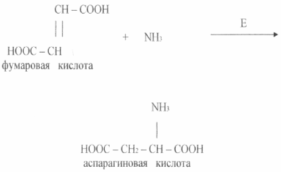 Экономически целесообразным являются способы получения аминокислот с помощью иммобилизованных ферментов и клеток. Сравнительно давно реализован процесс получения L - аспаргиновой кислоты из фумаровой и аммиака в одну стадию с помощью иммобилизованных клеток Escherichia coli или Pseudomonas aeruginosa, обладающая аспартазной активностью (см схему)