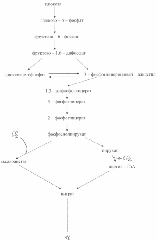 В основе сверхсинтеза глутаминовой кислоты из глюкозы у этих бактерий лежат два биохимических принципа: недостаток фермента а - кетоглутаратдегидрогеназы и блокировка биосинтеза биотина. Неспособность клеток синтезировать биотин приводит к увеличению проницаемости цитоплазмотической мембраны, что повышает экскрецию глутамата. Он образуется в результате аминирования а - кетоглутарата, неспособного к дальнейшим превращениям в цикле трикарбоновых кислот. При биосинтезе глутаминовой кислоты очень большое значение имеет концентрация биотина в среде. Необходимо обеспечить его концентрацию 1 - 5 мкг /л. В этом случае нарушается нормальный синтез фосфолипидов мембраны и последняя становится проницаемой для глутамата. При концентрации биотина 15 мкг/л наблюдается интенсивный рост биомассы. Проницаемость цитоплазмотической мембраны для глутамата можно снизить также при помощи пенициллина, добавляя его к среде во время логарифмической фазы роста. В этом случае фосфолипиды экстрагируются из мембраны и транспорт глутамата может осуществляться в течение 40 - 50 часов. Бактериальный синтез глутамата позволяет получать примерно 50 % - ный выход продукта из сахара и накапливать в среде ферментации до 200 г/л глутамата. Известны методы получения глутамата на этанольных средах (до 60 г/л) или на ацетате (до 98 г/ л)