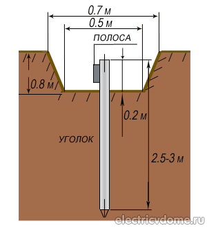 Для того чтобы создать все условия электробезопасности в частном доме необходимо при монтаже новой электропроводки или реконструкции старой в общий план работ включить такие работы как монтаж заземления. Монтаж заземления в частном доме не составляет особых трудностей по сравнению с монтажом заземления в многоэтажных домах. Контур заземления в частном доме состоит из вбитых в почву вертикальных заземлителей, которые соединяются между собой горизонтальными заземлителями и заземляющего проводника который соединяет контур заземления с электрощитом. В качестве вертикальных заземлителей обычно используют стальной уголок размерами 50×50х5 мм. Для горизонтальных заземлителей подойдет полосовая сталь 40×4 мм. Материалом для заземляющего проводника служит круглая сталь сечением 8-10 мм2. Более точные размеры и материал для заземлителей и заземляющих проводников можно найти в ПУЭ-7, раздел 1.7. Запрещено в качестве заземлителей и заземляющих проводников использовать арматуру. Объясняется это тем что наружный слой арматуры каленый, из за этого распределение тока по сечению нарушается, а также по другому проходят процессы окисления (быстрее ржавеет). Конструктивно контур заземления делают в виде равностороннего треугольника. Для этого, во дворе дома делаем разметку в виде равностороннего треугольника. Рекомендуется прокладывать контур заземления на расстоянии не более 1 м от фундамента дома. После разметки, выкапываем траншею по периметру размеченного нами треугольника глубиной приметно 0.8-1 м. и шириной достаточной для удобного обваривания, примерно 0.5-0.7 м. В этой траншее будет прокладываться горизонтальные заземлители. Теперь по вершинам треугольника будут вбиваться вертикальные заземлители на глубину 2-3 м. Забивать в землю уголки длиной 2-3 м можно обычной кувалдой, это абсолютно не трудно. Для облегчения этой работы уголок на конце заостряют, чтобы он лучше входил в землю. Также можно выкопать или пробурить небольшие колодцы по вершинам треугольника глубиной до 1.5 м, это даст возможность забить уголок в меньший слой земли.