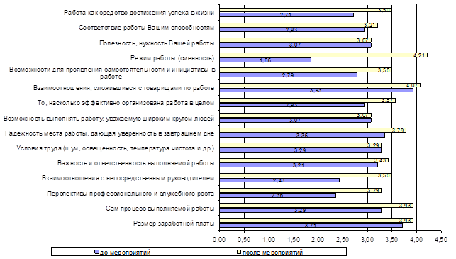 Итак, для повышения участия персонала в процессе принятия решений заместителем директора ежедневно проводятся оперативные совещания с персоналом фирмы, что позволяет своевременно выявлять возникающие проблемы. Результат повторного опроса представлен в таблице 6. Сравнительный анализ результатов, демонстрирующий эффективность предложенных мероприятий представлен и на рисунке 3. Таблица 6 - Оценка степени удовлетворенности работой после предложенных мероприятий