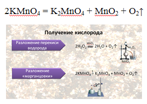 · в лаборатории ещё используют реакцию разложения перманганата калия – KMnO4 – «марганцовки».