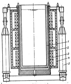 Рис. 3-31. Поперечный разрез индукционной тигельной плавильной печи для плавки магния. 1 – стальной тигель; 2 – изоляция; 3 – индуктор; 4 – магнитопровод; 5 – цилиндр механизма наклона