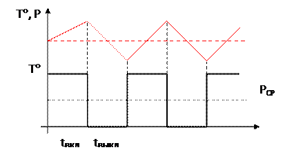 Рисунок 5.2 – Диаграмма работы релейного регулятора 5.2 Датчик температуры Основным источником погрешности при двухпозиционном методе регулирования является инерция термоэлектрического термометра. Поэтому к выбору термоэлектрического термометра необходимо подходить очень основательно. И для начала рассмотрим существующие на сегодняшний день типы датчиков температуры. В настоящее время для измерения температуры используют в основном три типа датчиков это термометры сопротивления, термоэлектрические термометры и полупроводниковые термометры. Измерение температуры термометрами сопротивления основано на свойстве металлов изменять свое электрическое сопротивление в зависимости от окружающей среды. Такой термометр состоит из термопреобразователя сопротивления, выполненного из тонкой металлической проволоки или ленты, намотанной на каркас, устройства для измерения электрического сопротивления и соединительных проводов. При измерении термометр помещают в среду, температуру которой нужно определить. Зная зависимость сопротивления от температуры, можно определить температуру среды. К преимуществам термопреобразователей сопротивления можно отнести высокую точность, особенно при низких температурах, и возможность присоединения нескольких термопреобразователей к одному измерительному устройству. Термопары являются довольнотоки точными приборами точными приборами, которые получили большое распространение в промышленности. Влияние температуры на электрофизические параметры полупроводников в основном проявляются в изменении концентрации носителей заряда, что приводит к соответствующему изменению электрической проводимости. На этом принципе работают полупроводниковые терморезисторы. В качестве полупроводниковых датчиков температуры также используются диоды и транзисторы, где изменение концентрации носителей заряда приводит к изменению тока, протекающего через полупроводниковый прибор. В датчиках температуры на основе диодов и транзисторов используют зависимость параметров p-n перехода в полупроводнике от температуры. Наибольшее распространение получило использование прямых параметров диодов и транзисторов. Их существенными преимуществами перед обратными являются линейность температурной зависимости, широкий диапазон рабочих температур, высокая стабильность. Чаще всего для измерения температуры используется прямое напряжение на p-n переходе при почти постоянном токе эмиттера. Изменение прямого напряжения составляет порядка 2,5 мВ·К-1. При повышении температуры транзисторов p-n-p типа напряжение эмиттер-база из области положительных значений переходит в область отрицательных. Температурные пределы применимости транзисторов в термодатчиках значительно шире, чем при использовании транзисторов по прямому назначению. Ограничение применимости со стороны высоких температур наступает вследствие перехода примесного полупроводника в собственный, уменьшения пробивного напряжения и повышения генерации носителей в базовой области при отрицательных напряжениях. Применимость при низких температурах определяется уменьшением концентрации основных носителей из-за дезактивации легирующих примесей и уменьшения коэффициента усиления по току. Основным недостатком рассматриваемых термод