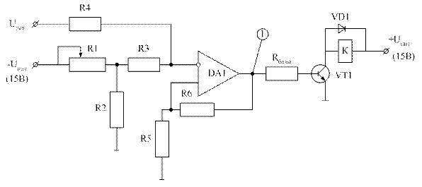 Определение зоны нечувствительности регулятора температуры tmax – максимальное значение температуры, tmax = 38°С; Uдат – напряжение датчика, UДАТ. = 1,85 В. R3 = 1 кОм; VD1 – необходим для закорачивания токов самоиндукции реле “К” R4 = 1 кОм. Определить: R1, R2, Uзад (R1, R2)