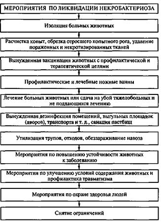Рис. 1.5. Мероприятия по ликвидации некробактериоза Меры борьбы. При установлении Диагноза хозяйство (ферма) объявляется неблагополучной и на него в соответствии с утвержденными правилами накладываются ограничения (рис. 1.5). Неблагополучное поголовье вакцинируют согласно наставлениям по применению вакцин. Здоровых животных обрабатывают с профилактической целью в ножных дезинфицирующих ваннах, как при лечении больных. Больных животных изолируют, лечат групповыми или индивидуальными методами или (если лечение нецелесообразно) сдают на убой на санитарную бойню. Ветеринарно-санитарную оценку мяса и мясопродуктов от больных животных проводят в соответствии с действующими правилами ветсанэк-спертизы. Молоко от больных животных пастеризуют, от здоровых — выпускают без ограничений. Трупы утилизируют одним из общепринятых способов. Ограничения с хозяйства снимают через 4 мес после последнего случая выздоровления, падежа или убоя больных животных и проведения заключительных мероприятий, предусмотренных инструкцией. Меры по охране людей от некробактериоза. Необходимо помнить, что некробактериоз — зоонозная инфекция, которой могут, хотя и редко, заражаться люди. Поэтому персонал ферм должен быть ознакомлен с мерами безопасности при работе с больными животными. В производственных помещениях необходимо иметь медицинские аптечки. При работе с больным скотом нужно соблюдать правила личной гигиены. При ранах, травмах и т.д. обрабатывают указанные места имеющимися в наличии средствами из аптечек. В случае подозрения в заболевании людей их необходимо направить к врачу. Контрольные вопросы и задания. 1. Дайте характеристику возбудителя и условий, способствующих возникновению болезни. 2. Каковы формы клинического проявления некро-бактериоза у разных видов животных? 3. Какие мероприятия необходимо проводить в благополучном хозяйстве с целью недопущения болезни? 4. Определите место специфической профилактики болезни в системе оздоровительных мероприятий при некробактериозе. 5. Перечислите средства и укажите режим их применения при проведении химиопрофилак-тики и химиотерапии (ножные ванны) при некробактериозе. Date: 2015-08-07; view: 447; Нарушение авторских прав |