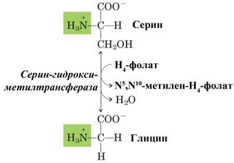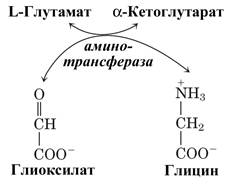 Рис. Структура тетрагидрофолата – одного из основных переносчиков одноуглеродных фрагментов в клетке (синим указаны атомы азота 5 и 10, к которым происходит присоединение одноуглеродных фрагментов – метильных, метиленовых, формильных и других групп). Глицин Синтез глицина в тканях млекопитающих осуществляется несколькими путями. В цитозоле печени содержится глицинтрансаминаза, катализирующая синтез глицина из глиоксилата, донором аминогруппы выступает глутамат (или аланин). В отличие от большинства реакций переаминирования равновесие этой реакций сильно смещено в направлении синтеза глицина.