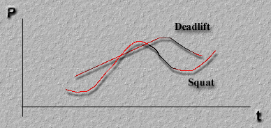 Если я рассчитываю присесть на соревнованиях 300 кг, то 70-72% - 215 кг, идем дальше ищем КПШ(количество подъемов штанги)- 5000/215= 23,25 (~ 24) Рекомендуемое количество повторов для этой интенсивности(см. таблицу) - 2. То есть, на этой тренировке вы должны присесть (287.5-2)-2. По аналогии вам нетрудно будет рассчитать себе весь макроцикл, только помните, что нет необходимости в высокой точности, если у вас получилось 289 кг - поставьте на штангу 290(это рекомендация относится ко всем математическим операциям, описываемым выше). Так как приседания и тяга - это самые большие веса, проводить в одну неделю две одинаково тяжелые тренировки опасно и травматично. Поэтому имеет смысл периодизировать нагрузку в противофазе, примерно это изображено на нижеследующем графике.