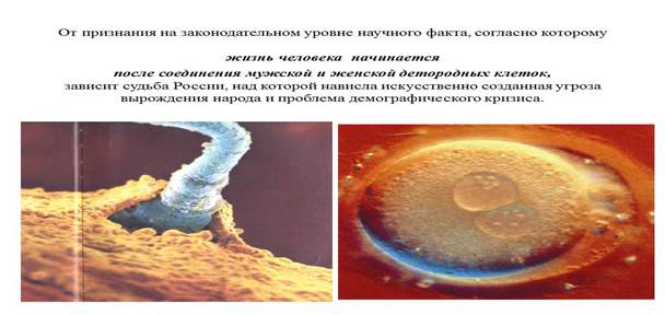 · Официально признать научный факт того, что жизнь человека начинается при соединении детородных клеток отца и матери. Признание этого факта закрепить в законодательных актах, касающихся жизни и здоровья человека, в частности, в п.2, ст.17 Конституции РФ «Основные права и свободы человека неотчуждаемы и принадлежат каждому от рождения» предлагается добавить две буквы к слову «рождения». Тогда «Основные права и свободы человека неотчуждаемы и принадлежат каждому от за рождения».