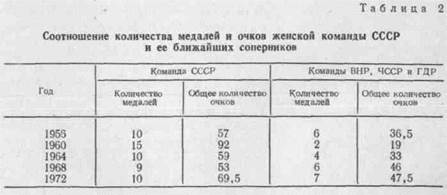 Так же как и на предыдущих олимпийских играх, на XX Олимпиаде в Мюнхене советские гимнастки добились блестящих успехов. Наши спортсменки набрали 380,50 балла, а их основные соперницы — команда ГДР — 376,55 балла. Хорошо выступили на этих соревнованиях гимнастки ЧССР, ВНР и СРР. Средняя сумма баллов советской гимнастки была равна 76,1 балла. Лучшая гимнастка, завоевавшая золотую медаль в многоборье (Л. Турищева), набрала 75,775. Разница в сумме баллов между первой и пятой составила всего 1,250 балла. Средняя сумма баллов участницы женской команды ГДР составляет 75,3, т. е. на 0,8 балла меньше, чем нашей. Если учесть, что команда ГДР получила меньше нашей всего на 4,05 балла, а также и то, что она отстала от советской команды в неофициальном зачете всего на 22 очка, то можно с уверенностью сказать, что как по уровню мастерства команды в целом, так и по результатам лидеров она являлась самой сильной соперницей. В составе советской команды на XX Олимпийских играх были три великолепных лидера: Л. Турищева, О. Корбут и Т. Лазако-вич. Фактически каждая из них могла бороться за звание абсолютной чемпионки. Большой вклад в победу нашей команды внесли также Л. Бурда, Э. Саади и А. Кошель. В общей сложности наши гимнастки завоевали 4 золотые, 3 серебряные, 3 бронзовые медали и 69 очков в неофициальном зачете.