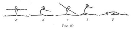 на руках (см. рис. 1,з). В последнем случае стойка может быть узкой (кисти на половину ширины плеч), сомкнутой (кисти рядом), на одной (правой, левой) руке, то же, но ноги врозь и т. п. Способы выхода в стойки принято кратко обозначать так: с и-лой (руки сгибаются в локтевых суставах, ноги в тазобедренных), перекатом (вращательным движением с последовательной опорой махом правой или левой ногой); согнувшись (руки прямые, тело сгибается в тазобедренных суставах), прогнувшись (руки сгибаются, тело держится прогнутым), прогнувшись прямыми руками (выполняется через горизонтальный упор), прыжком (на руки), переворотом назади др. В парных и групповых упражнениях применяются аналогичные термины, но указывается исходное положение и конечное каждого участника, какой частью тела верхний акробат опирается на ту или иную часть тела нижнего.