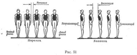 жены окна, то группа строится спиной к ним. Классифицируются строевые упражнения на следующие четыре группы: 1. Строевые приемы. 2. Построения и перестроения. 3. Передвижения. 4. Размыкания и смыкания. Основные понятия для применения строевых упражнений показаны на рис. 51. Строй —установленное размещение занимающихся для совместных действий. Управление строем на занятиях осуществляют преподаватели и студенты (старосты групп, старшие учебных отделений и дежурные) посредством команд и распоряжений, которые обычно подаются го- лосом или установленными сигналами. Основные наименования строя и его расположения: Сомкнутый строй—строй, в котором занимающиеся располагаются в шеренгах один от другого на интервал, равный шири-