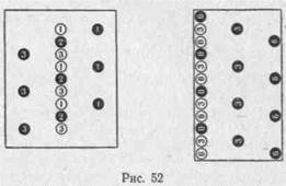(левые) плечи вперед, шагом — МАРШ!», «Группа — СТОЙ!» Последняя команда подается в тот момент, когда занимающиеся дойдут до своего места в шеренге. Перестроение из одной колонны в три уступом. После предварительного расчета по три подается команда: «Первые номера — два (три, четыре и т. д.) шага вправо, третьи номера —два' (три, четыре и т. д.) шага влево шагом—МАРШ!» Для обратного перестроения подается команда: «На свои места шагом —МАРШ!» Перестроение выполняется приставными шагами (рис. 52). Перестроение из колонны по одному в колонну по два (три и т. д.) поворотом в движении. При движении группы налево в обход* подается команда: «В колонну по два (три, четыре и т. д.) налево — МАРШ!» (как правило, команда подается, когда группа находится на верхней или нижней границе зала или площадки). После поворота первой двойки (тройки, четверки и т. д.) следующие делают поворот по команде своего замыкающего на том же месте, что и первые. Здесь же можно дать указание об интервале и дистанции, с тем чтобы не размыкать колонну потом специально (рис. 53). Для обратного перестроения подаются команды: «Напра-ВО!», «В колонну по одному направо (налево) в обход шагом — МАРШ!» При обучении целесообразно показать перестроение на нескольких занимающихся, останавливая их соответствующими командами. * Под движением группы «в обход» следует понимать передвижение вдоль границ зала или площадки.