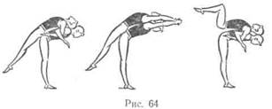 Упражнения для мышц туловища и шеи 1. Наклоны головы и туловища вперед (с прямой и согнутой спиной), назад, в стороны из основной стойки, руки вверх, в стороны, за головой, стойки ноги врозь, стойки на коленях, из седа на полу и гимнастической скамейке; то же, но с гимнастической палкой, гантелями, набивным мячом, штангой на плечах (рис. 63) с партнером на спине (рис. 64). 2. Повороты головы и туловища направо и налево. Повороты удобно делать в стойке ноги врозь и в седе ноги врозь. Наиболее эффективные исходные положения рук: руки в стороны, руки вверх с гимнастической палкой, со штангой на плечах, за спиной или на лопатках. 3. Наклоны головы и туловища с поворотами: а) из стойки ноги врозь, руки в стороны, наклон вперед с пря б) из седа ноги врозь на гимнастической скамейке или на полу 4. Вращение головы и туловища: а) из стойки ноги врозь, руки на пояс, за голову вверх круговые движения головой и туловищем вправо и влево; то же, сидя на гимнастической ска стенку или удерживаются партнером; б) круговые движения туловищем со штангой на плечах, с набивным мячом или гантелями, поднятыми вверх. 5. Сгибание и выпрямление туловища в упоре лежа, в упоре лежа сзади, в упоре стоя на коленях: а) в упоре стоя на коленях поднимание и опускание спины б) поднимание обеих ног лежа, сидя, в висе, в упоре; то же в) из положения лежа на спине переход в сед; прогибание туловища, лежа на груди. 6. Упражнения в статических положениях: а) удерживать поднятые ноги в висе и упоре на 95, 90, 60° в те б) в висе и упоре удерживать ногами груз (набивной мяч, ган в) наклоны с прямой спиной, удерживая позу 10—15 сек. 7. Упражнения с расслаблением мышц туловища и шеи: а) стоя ноги врозь, наклон вперед с расслаблением мышц туло б) в наклоне вперед напряжение и последующее расслабление в) из положения сидя, стоя на коленях и лежа расслабление Упражнения для мышц ног 1. Поднимание и опускание ноги: из положения стоя, сидя и лежа поднимание ноги вперед, назад, в сторону (медленно и быстро); то же (преодолевая сопротивление амортизатора или поднимание ногой груза (мешочки с песком).. 2. Сгибание и выпрямление ног: а) стоя, сидя, лежа сгибание и выпрямление ноги вперед, назад, б) сидя, лежа, в висе и упоре сгибание и выпрямление ног; то в) полуприседание и приседание на обеих и одной ноге, с опорой г) выпады вперед, назад в стороны; то же с грузом (набивные д) пружинящие движения в приседе, выпаде, в широкой стойке е) прыжки на месте и с продвижением вперед на двух и одной 3. Повороты ноги наружу и внутрь: из стойки на одной ноге, другая вперед, назад, в сторону поворот ноги внутрь и наружу; то же из положения сидя и лежа. 4. Круговые движения стопой и ногой из положения стоя, сидя и лежа. 5. Взмахи ногами вперед, назад, в сторону из положения стоя, сидя, лежа. Взмахи выполняются стоя у опоры (гимнастическая стенка, какой-либо гимнастический снаряд, стул) и без опоры руками. 6. Упражнения в статических положениях: а) полушпагаты и шпагаты (5, 10, 15, 20 сек.); б) удержать ногу, поднятую вперед, назад, в сторону, на высоте