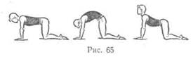 вища вправо сгибать левую ногу, а при наклоне влево — правую ногу). 4. В упоре лежа сгибание и выпрямление рук с одновременным подниманием и опусканием ноги. 5. Волнообразное движение телом (движение начинается руками, затем продолжается туловищем и ногами). 6. Мост из положения лежа на спине и наклоном назад, стоя спиной к гимнастической стенке, с помощью партнера и самостоятельно. 7. В висе спиной к гимнастической стенке поднимание ног до касания носками рейки; то же, поднимая ногами груз (набивной мяч, мешочек с песком). 8. Из виса стоя сзади согнувшись на гимнастической стенке переход в вис прогнувшись с согнутыми и прямыми ногами (рис. 66); то же, поднимая ногами груз (набивной мяч, мешочки с песком). 9. Упражнение в расслаблении мышц всего тела: а) лежа, расслабление мышц всего тела; б) лежа, максимальное напряжение мышц тела и последующее в) постепенное расслабление одних групп мышц в сочетании с 10. Упражнения на ощущение правильной осанки (описаны в Date: 2015-08-07; view: 635; Нарушение авторских прав |