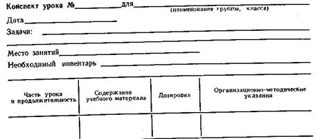 Конспект урока наиболее полно раскрывает содержание, методику и организацию занятий. Он составляется на основании рабочего плана. В конспекте урока определяются задачи урока, продолжительность его частей, чередование видов упражнений, их содержание, дозировка, основные построения и перестроения, организация и методика проведения урока. При составлении очередных конспектов необходимо учитывать результаты предыдущего урока, а также наличие оборудования и инвентаря. Конспект составляется заблаговременно. Форма конспекта урока следующая: