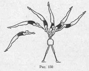 ления ошибок рекомендуется выполнять отдельные фазы прыжка в облегченных условиях, чтобы гимнаст смог лучше сосредоточить внимание на снаряде, разбеге и других деталях. С этой целью рекомендуются подводящие упражнения, описанные выше (см. период предварительной подготов- ки). Далее прыжок ноги врозь изучается в такой последовательности: 1) через козла в длину; 2) через коня в ширину с ручками; 3) через коня в ширину без ручек; 4) через двух козлов, поставленных вплотную, толчком о дальний снаряд; 5) через коня в длину (высота 100 см) с положенным на него матом; то же, но без мата. Постепенное увеличение длины и высоты препятствия (длины и высоты полета) — важное правило при разучивании всех прыжков. Прыжок согнув ноги толчком о дальнюю часть коня (рис. 149). При прыжке на снаряд гимнаст держит ноги прямыми. Преждевременное их сгибание в коленных суставах несколько облегчает выполнение прыжка, но ухудшает зрительное впечатление. Сгибан^ие ног в коленных суставах начинается с постановкой рук на снаряд. Гимнаст подтягивает сомкнутые ноги к груди, как бы группируется. Закончив толчок руками, он начинает разгибаться, поднимая плечи и руки вверх, а также опуская и выпрямляя ноги. Отведение плеч назад — грубая ошибка, которая приводит к «перекруту», в результате чего возможно неточное приземление и даже падение на спину. Поэтому необходима хорошая страховка. При страховке стоять у места приземления немного сбоку и в случае необходимости поддержать гимнаста за руку выше локтя или под спину. Последовательность разучивания: а) опираясь руками о гимнастическую стенку (прямые руки на уровне плеч), толчком двумя ногами прыжки на месте, сгибая ноги. При выполнении упражнения таз поднимать возможно выше, плотно группироваться, ноги не разводить;