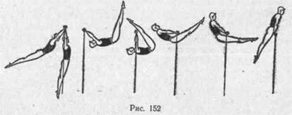1. Подъем назад (рис. 154). Махом вперед из виса хватом сверху гимнаст выполняет перемах согнувшись и, посылая ноги назад-вверх (оставляя голову на груди), делает как бы неполный мах