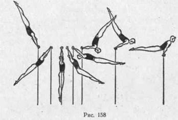 мах назад, необходимый для подъема, должен быть как можно сильнее. В основной стадии упражнения, проходя в висе хватом сверху нижнее вертикальное положение, гимнаст энергичном движением посылает ноги назад-вверх и прогибается. При этом руки и туловище по-прежнему располагаются на одной прямой линии, голова втянута в плечи и несколько опущена на грудь. В высшей точке движения спортсмен слегка приподнимает голову и, нажимая прямыми руками на перекладину, посылает плечи вперед, стремясь перейти в упор. Ноги должны оставаться --win ди*1л\пи uci аьаться как можно выше: это позволяет в дальнейшем сделать полноценный мах вперед в упоре. Последовательность разучивания: а) освоить подъем махом назад после размахиваний увеличи б) разучить (или повторить) мах дугой в висе. В высшей точ в) выполнить подъем махом назад в соединении с махом дугой из виса или упора. Упражнение делается с применением петель и без них. В последнем случае нужно внимательно страховать гимнаста и контролировать движения его кистей, так как на данном этапе обучения возможны срывы со снаряда. 2. Подъем переворотом в упор (рис. 158). Простые варианты упражнения обычно выполняются после маха назад из упора в вис,