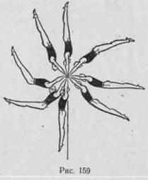 в) освоить подъем переворотом после маха назад из упора в вис. Основная задача гимнаста — возможно точнее определить момент разгибания тела и опускания в упор. При большом махе преждевременное сближение со снарядом приводит к закручиванию в упоре, а позднее —к неполному переворачиванию тела и падению тазом на перекладину. Большие обороты •1. Большой оборот назад (рис. 159) делается после отмаха назад из упора в стойку на руках, после оборота назад из упора