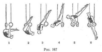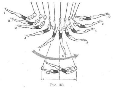 В полете тело гимнаста прямое, что позволяет в последующем усложнять данный соскок. Перед приземлением он начинает слегка сгибаться в тазобедренных суставах и поднимает руки вверх-в стороны. Последовательность разучивания: а) размахивания в висе с акцентированным броском ногами б) соскок переворотом назад, сохраняя прямое положение тела в) сальто назад на батуте, с трамплина, сохраняя прямое по г) сальто назад на кольцах. Движения махом назад 1. Высокий выкрут вперед прогнувшись относится к довольно сложным связующим элементам, выполняемым большим махом назад. Широко используется в упражнениях гимнастов старших разрядов, но технически совершенное выполнение доступно лишь" спортсменам, обладающим наряду с хорошей подвижностью в плечевых суставах и поясничном отделе позвоночника достаточной силой мышц плечевого пояса и спины. В высоком выкруте вперед прогнувшись с последующим махом назад плечевые суставы, определяющие характер виса, поднимаются над уровнем колец. Сделав предварительный мах вперед (обязательное условие!), необходимый для выполнения этого упражнения, гимнаст приближается к нижней вертикали, «провисая» в плечевых суставах (голова опущена на гоудь) и незначительно опережая «округленной» спиной движение ногами. С началом движения ногами кверху он активно нажимает руками вниз-в стороны и несколько отводит голову назад. Дождавшись в таком положении, когда ноги пройдут верхнюю вертикаль, и постоянно нажимая руками на кольца, спортсмен выводит немного плечи вперед и слегка опускает голову на грудь. Приближаясь к горизонтали, он выпрямляется и наклоняет голову вперед; руки (по отношению к туловищу) принимают положение вперед-вверх-наружу, продолжая ощущать опору о кольца. Последовательность разучивания: а) размахивания в висе; б) выкрут вперед прогнувшись; в) выкручивание вперед, сохраняя опору при положении плеч г) высокий выкрут вперед прогнувшись. 2. Подъем махом назад в упор — сложное упражнение, выпол- няемое большим махом назад, требующее приложения значительных физических усилий. Выполняется после маха дугой, выкрута вперед и переворота вперед из стойки на руках (первая половина большого оборота вперед). Перемещаясь к нижней вертикали и сохраняя округленной спину, спортсмен максимально провисает в плечевых суставах, после чего начинает активное бросковое движение ногами назад. Усиливая мах ногами назад-кверху, он начинает активно нажимать руками на кольца в стороны-книзу. Одновременно с этим туловище перемещается до уровня колец, а ноги несколько выше. Этот момент характеризует'переход из виса в упор. Используя набранную скорость и прилагая значительные усилия, гимнаст выходит в упор. Последовательность разучивания: а) лежа на коне лицом вниз, имитационное движение руками б) высокий выкрут вперед; в) высокий выкрут вперед и подъем махом назад, сохраняя г) из упора стоя на низко опущенных кольцах махом одной и д) серия высоких выкрутов вперед с постепенным увеличением е) подъем махом назад в упор с помощью подвесного пояса; ж) подъем махом назад в упор. 3. Сальто вперед согнувшись относится к числу довольно распространенных соскоков, выполняемых большим махом назад; встречается в произвольных программах гимнастов многих разрядов. Наиболее доступен спорстменам с «мягкими» плечами, хорошо владеющим