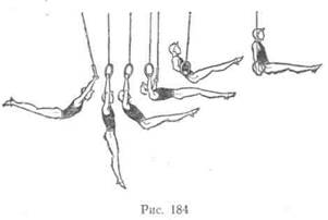нений необходимо в совершенстве овладеть их общей технической основой — размахиванием. Особенно важно сделать это в начальной стадии обучения. Поскольку размахивания состоят из повторяющихся махов вперед и назад, рассмотрим один из них, например из крайнего положения маха вперед в крайнее положение маха назад. Незначительно опережая спиной и тазом движение ног, спортсмен перемещается вниз и, проходя нижнюю вертикаль, выполняет энергичное хлестообразное бросковое движение ногами по дуге назад-вверх. Примерно то же происходит и при махе вперед, но в первой части маха движение опережает передняя поверхность туловища. Необходимо обратить особое внимание на прохождение виса, положение тела в конечных точках маха (достижение уровня горизонтали) и постоянное натяжение тросов колец. Последовательность разучивания: а) освоение правильного виса; б) размахивания малой амплитуды в висе выпрямленным 34Ф в) освоение конечных положений маха на перекладине и коль г) постепенное увеличение амплитуды маха с сохранением тре Движения махом вперед 1. Подъем махом вперед в упор (рис. 184) относится к довольно сложным упражнениям, хотя и не требует особой физической