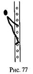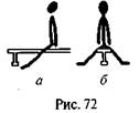 положения относительно скамейки, например: сед ноги врозь на скамейке поперек (рис. 72, а, б), упор лежа на скамейке продольно (рис. 73), упор лежа на скамейке поперек (рис. 74). Иногда положение относительно скамейки можно определить и без специального указания на это, например: стойка на левой, правую вперед на скамейку (рис. 75), упор лежа, ноги на скамейке (рис. 76). В записи и. п. на стенке указывается положение относительно нее и особенности хвата, например: вис стоя сзади на третьей рейке снизу (рис. 77), вис стоя левым боком на рейке, хват левой снизу на уровне пояса, правой — сверху над головой (рис. 78), вис стоя лицом к стенке, хват на уровне плеч (рис. 79).