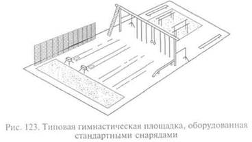 рого выполняется программа по разделу «Гимнастика» каждой из возрастных групп. Для старших школьников необходимо следующее оборудование: площадка размером 15x40 м, позволяющая разместить на ней комбинированную установку для подвесных снарядов (колец, канатов, шестов), гимнастические лестницы, перекладины, брусья, гимнастические стенки (до 12 пролетов), ямы для опорных прыжков и прыжков в длину. На оборудованной таким образом площадке может заниматься одновременно 40 человек. На рисунке 123 показана типовая гимнастическая площадка, оборудованная стандартными гимнастическими снарядами.