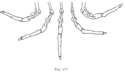 вперед и активно нажимают на кольца. Затем начинается мах вперед. Активными движениями руками назад и вперед обеспечивается постоянное натяжение колец, необходимое для эффективного размахивания (см. рис. 177). При обучении размахиванию вначале изучают правильный вис, потом оказывают помощь в выполнении махов, постепенно увеличивая их амплитуду, затем предоставляют возможность выполнить размахивание самостоятельно. Выкрут вперед из виса согнувшись выполняется только махом назад. После прохождения телом вертикали тотчас же делается хлестовое движение ногами назад-вверх, руки постепенно разводятся в стороны, нажимают на кольца и поворачиваются наружу; плечи подаются вперед, голова отводится назад. В конце маха, когда ОЦМ будет выше горизонтали, делается выкрут в плечевых суставах (см. рис. 178). Завершается упражнение висом согнувшись или прогнувшись. Успех его выполнения зависит от момента количества движения, созданного в первой части упражнения, от силовых возможностей мышц задней поверхности туловища и ног, работы мышц рук и подвижности в плечевых суставах. Изучать это упражнение рекомендуется в следующей последовательности: из положения наклона вперед руки вверх, кисти сжаты в кулак, поворачивая кисти большими пальцами внутрь и затем вниз (про-нируя кисти рук), развести руки в стороны и далее с одновременным наклоном головы вперед привести руки к бедрам, еще больше сгибаясь в тазобедренных суставах; исходное положение то же, но, захватив кистями кольца на высоте плеч, проделать это же упражнение, закончив его выкрутом в положение виса стоя сзади; из виса присев или виса стоя на низких кольцах с прямыми руками, разводя их в стороны и поворачивая наружу, толчком ног выполнить выкрут в вис согнувшись; выкрут прогнувшись с помощью вначале под бедро, в конце под спину. Страховка и помощь оказываются стоя сбоку под грудь и бедра. Подъем махом вперед выполняется из размахивания в висе. В конечной точке маха назад ОЦМ тела предельно удаляется от опоры, создается возможно больший момент инерции тела. На махе вперед при подходе тела к вертикали грудь и живот обгоняют ноги, натягиваются мышцы передней поверхности тела. Затем за счет их энергичного сокращения ноги хлестовым движением посылаются вперед-вверх. Ими создается наибольший момент количества движения. Далее, опираясь на ноги и нажимая на кольца прямыми руками, делается рывковое движение вниз. Теперь уже туловище обгоняет ноги и за счет этого перемещается вверх, в упор (рис. 180). При обучении рекомендуется выполнять: из виса лежа на низких кольцах (стопы вытянутых ног на гимнастическом коне) резкое прогибание и сгибание в тазобедренных суставах с одновременным нажимом руками на кольца с последующим выходом в упор; подъем силой в быстром темпе со значительным сгибанием в тазобедренных суставах; соскок махом вперед на кольцах, на перекладине и на брусьях; то же на наклонных жердях, лицом к высоким концам; подъем махом вперед на кольцах с помощью и самостоятельно. Страховка и помощь оказываются стоя сбоку под спину и ноги. Подъем махом назад выполняется из размахивания в висе. В конечной точке маха вперед ОЦМ тела предельно удаляется от опоры за счет отведения колец назад за голову, выпрямления тела с положением ног выше колец, закрытого положения груди, втянутого живота, ок