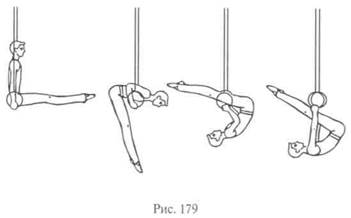 Висы смешанные характеризуются дополнительной опорой о снаряд или пол каким-либо звеном тела. Наиболее распространенными упражнениями являются: вис стоя, лежа, присев, присев сзади (спиной к снаряду), стоя сзади и лежа боком (продольно и поперек), вис стоя согнувшись и прогнувшись, вис лежа сзади и лежа ноги назад, вис на левой (правой) и на подколенках, вис на носках и завесом в кольца (то же в одно кольцо, то же ' отпуская одну руку), вис прогнувшись опорой стопами о тросы. Висы простые являются исходными положениями для выполнения многих упражнений. В середине комбинации они носят самостоятельный характер. Наиболее распространенными из них являются: вис на прямых и согнутых руках, вис сзади, согнувшись, прогнувшись и углом, горизонтальный вис сзади и спереди. Вис на согнутых руках характеризуется предельным сгибанием рук, кисти поворачиваются и прижимаются пальцами к груди. Вис сзади выполняется из виса согнувшись опусканием ног и туловища до предела назад и вниз, требует значительных мышечных усилий и подвижности в плечевых суставах. Вис согнувшись является основным исходным или конечным положением при выполнении многих простых элементов, связок и комбинаций. На начальном этапе обучения он выполняется как самостоятельное упражнение из размахивания в висе, толчком двух ног, махом одной и толчком другой, силой. Во время виса руки должны быть прямыми (кольца параллельно туловищу), голова наклонена к груди, ноги прямые и подняты в положение согнувшись под углом 45° к продольной оси туловища, ОЦМ тела — в плоскости тросов (рис. 178). Страховка и помощь оказываются стоя сбоку поддержкой обучаемого за руку или под шею и поясницу. Вис прогнувшись также может быть исходным или конечным положением при выполнении многих элементов, связок и комбинаций. Он выполняется из виса согнувшись, из размахивания в