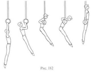 Из упора углом опускание вперед в вис согнувшись выполняется за счет медленного сгибания рук и опускания плеч вперед и вниз, не поднимая таза вверх, поворота колец наружу, разгибания рук и медленного опускания в вис согнувшись. Во время опускания кольца прижимаются к тазу. Упражнение выполняется в медленном темпе без рывков (см. рис. 179). Изучается оно на низких кольцах с помощью и самостоятельно. Страховка и помощь оказываются стоя сбоку за ноги, под грудь и спину. Оборот вперед согнувшись из упора выполняется без остановки за счет медленного сгибания рук и опускания плеч вперед и вниз, не поднимая таза вверх, поворота колец наружу и медленного опускания в вис согнувшись на согнутых руках в глубоком хвате. Продолжая поворачивать кисти, плечи подать вперед и, не разгибаясь в тазобедренных суставах, выполнить подъем силой. Для изучения этого упражнения рекомендуется выполнить из виса лежа и виса согнувшись глубоким хватом переход в упор на согнутых руках, на низких кольцах с помощью и без нее — на высоких. Страховка и помощь оказываются стоя сбоку под спину и ноги. Подъем силой выполняется из виса глубоким хватом на прямых руках, кисти развернуты вперед-наружу. Подтягиваясь и слегка сгибаясь в тазобедренных суставах, отвести плечи несколько назад, кисти рук при этом держать поближе друг к другу, локти вперед. Затем, нажимая руками на кольца и разворачивая кисти, быстро подать плечи вперед, локти отвести назад и выйти в упор на согнутые руки, выпрямляя руки, прогнуться. Подъем выполняется в одном темпе, без остановок (рис. 182). При обучении выполняются следующие подводящие упражнения: вис и подтягивание в висе простым и глубоким хватом; подъем силой из виса стоя глубоким хватом, толчком двух ног; подъем силой из виса лежа глубоким хватом, опираясь ногами о пол или другую опору (козел, табурет и др.); подъем силой с помощью за бедро и голень.