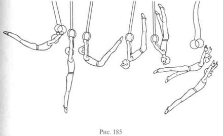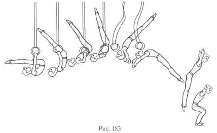 Соскок махом назад из виса согнувшись выполняется за счет активного разгибания в тазобедренных суставах, движения ногами по дуге (вверх, вперед, вниз, назад) и нажатия прямыми руками на кольца в конце маха назад. Плечи поднимаются до уровня колец, тело прогнуто. При выполнении соскока делается бросковое движение (хлест) — как при подъеме махом назад. При изучении рекомендуется выполнить: правильное размахивание в висе с акцентированным махом назад и нажимом прямыми руками на кольца; мах дугой из виса согнувшись с акцентированным махом назад и нажимом прямыми руками на кольца и возвращение в исходное положение; соскок махом назад из размахивания в висе и из виса согнувшись с помощью. Страховка и помощь оказываются стоя сбоку одной рукой под живот, а другой под поясницу от начала выполнения до приземления. Соскок дугой выполняется из виса согнувшись. Для этого надо, направляя ноги вверх-вперед, активно разогнуться и, нажимая на кольца, развести руки в стороны. В момент полного разгибания отпустить руки и соскочить. Соскок выполняется на большой амплитуде (рис. 183). Для изучения соскока используются следующие подводящие упражнения: имитация движения соскока лежа на спине на полу; выполнение соскока на низких кольцах, не отпуская и отпуская руки в момент приземления; выполнение соскока дугой на кольцах средней высоты и на высоких кольцах с помощью, а затем и самостоятельно. Страховка и помощь оказываются стоя сбоку поддержкой под спину и грудь. Соскок выкрутом назад выполняется из виса согнувшись. Для этого надо разогнуться ногами вверх-назад, нажимая на кольца, развести прямые руки в стороны, поворачивая кисти вперед. Завершается соскок выведением рук вверх — в стороны, опусканием
