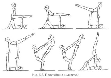неров. Из этой группы в гимнастике используются одиночные и парные упражнения. В одиночных упражнениях выделяются четыре подгруппы: шпагаты, мосты, равновесия, стойки. В парных упражнениях применяются различные виды поддержек (рис. 233), их освоение начинается с изучения основных хватов руками (рис. 234). Бросковые упражнения связаны с подбрасыванием и ловлей со-упражняющихся с захватом за голень, бедро, кисти, стопу и т. п., с приземлением на дорожку или на плечи партнера. В бросковых движениях выделяются: бросок и ловля одного партнера другим, одного партнера несколькими соупражняющимися, с неполным вращением, с полным вращением, пируэты, соскоки. Акробатические упражнения выполняют на специальных акробатических дорожках или гимнастических матах. Ими можно заниматься не только в специализированных залах, но и на открытых площадках. Большое разнообразие акробатических упражнений, высокая эмоциональность, минимальная потребность в специальном оборудовании делают их доступными для занятий с различным контингентом занимающихся и предоставляют педагогу широкие возможности для разностороннего воздействия на занимающихся. В настоящее время без хорошей акробатической подготовки невозможно достичь высоких результатов как в спортивной, так и художественной гимнастике. Акробатические упражнения в основном определяют трудность вольных упражнений. Кроме того, двигательные навыки и способности, развиваемые при выполнении акробатических упражнений, оказывают большую помощь в освоении упражнений других видов многоборья, а также в формировании навыков самостраховки. Акробатические упражнения находят все большее применение в основной и прикладных видах гимнастики (профессионально-прикладной, военно-прикладной, спортивно-прикладной). Они используются в подготовке летчиков, моряков, космонавтов, в занятиях с представителями актерской профессии и во многих