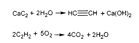 Опыт 7. Получение ацетилена и его горение. Эту работу проводить в вытяжном шкафу, так как неочищенный ацетилен, полученный из кальций карбида, содержит вредные, неприятно пахнущие примеси. В пробирку поместить маленький кусочек кальций карбида СаС2, добавить около 1 мл воды и закрыть пробирку пробкой с газоотводной трубкой, имеющей оттянутый конец. В пробирке бурно выделяется газообразный ацетилен. Поджечь ацетилен у конца газоотводной трубки. Он горит светящимся, коптящим пламенем. Химизм процесса: