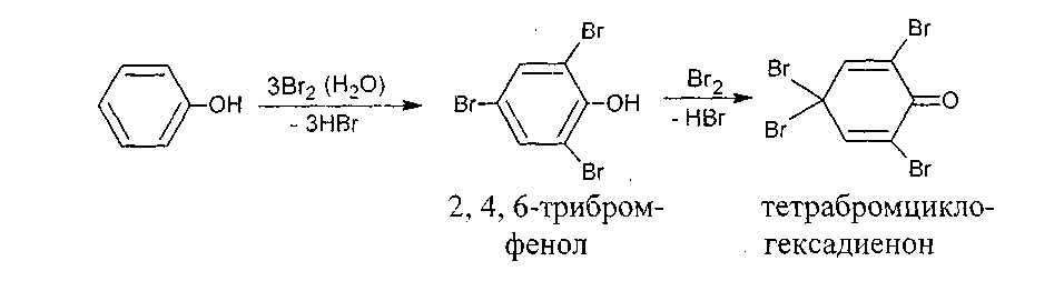 купрум (II) глицерат Опыт 6. Взаимодействие фенола с бромной водой и раствором щелочи. а) В пробирку помещают 1 мл водного раствора фенола и при встряхивании по каплям прибавляют бромную воду. Раствор обесцвечивается, и выпадает белый осадок. При добавлении избытка бромной воды осадок превращается в желтый.