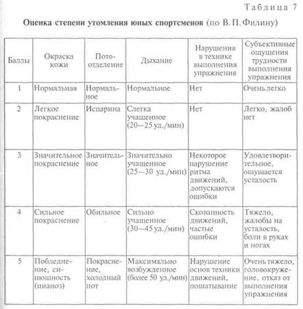 где </0 _ количество дыханий в 1 мин в покое; dx — количество дыхании после нагрузки; п — количество циклов движений. Общую величину нагрузки (объем и интенсивность) определяют по потере веса за тренировочное занятие или спортивное соревнование. Потеря в весе 800 г и более говорит о большой нагрузке, 500 — 800 г — о средней и 300 — 500 г — о малой. О величине нагрузки можно судить по пульсу: мышечная работа большой тяжести вызывает учащение пульса до 150 — 180 уд/мин, средней тяжести — 120 — 149 уд/мин и легкая работа — 90 — 119 уд/мин. Эти показатели больше характерны для гимнастов старшего школьного возраста. Для других возрастных групп они могут быть несколько другими. Педагогу важно уметь определять степень утомления юных гимнастов по внешним признакам (табл. 7).