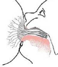 Теперь у ребенка грудь глубоко в ротике, сосок там, внутри, касается границы твердого и мягкого неба. Обратите внимание, что снизу ареола глубже в ротике, чем сверху. Ребенок так плотно прижат к маме, что ей сверху видно только щечку, плотно прижатую к груди. Если на секунду слегка отодвинуть малыша от груди, станет заметно, что его губки развернуты, нижняя губа полностью отогнута. угол между верхней и нижней губой - не меньше 140°. А если уж совсем полюбопытствовать, и аккуратно отодвинуть уголок рта, будет виден язычок, охватывающий грудь. Когда малыш сосет грудь правильно, его щечки надуты, а не втянуты. Подбородок глубоко упирается в мамину грудь. Носик может либо быть в стороне, либо слегка касаться груди. В таком случае малыш все равно успешно дышит, через маленькие треугольные щелочки между грудью и крыльями носа. Если кроха сильно упирается носом и ему все-таки неудобно дышать - скорее всего, его подбородок расположен недостаточно близко к маминой груди, а голова наклонена вперед. В таком случае не надо делать ямку в груди пальцем, надо сместить всего малыша назад, в направлении его ножек и плотнее прижать к себе. Его шейка выпрямится, подбородок глубже упрется в грудь, а носик освободится. Если чувствуете, что ребенок при этом захватил грудь неглубоко, лучше аккуратно забрать у него грудь (разжав пальцем десенки, чтобы не повредить сосок), и приложить его еще раз А так прикладывание малыша к груди выглядит в движении © Виктория Нестерова 2005. All rights reserved http://breastfeeding.narod.ru/latch.html Ассиметричный захват груди. Все знают, почему необходимо правильное прикладывание к груди – это и безболезненное кормление, и отсутствие трещин, и сытый довольный ребенок, и всегда достаточное количество молока. Известно, что в ротике ребенка должны оказаться не только сосок, но и большая часть ареолы – темного околососкового кружка. Но как это осуществить на практике? Давайте разберемся. Ребенок сцеживает молоко из груди волнообразными движениями язычка. Все подвижные, «рабочие» части ротика находятся снизу. Поэтому очень важно, чтоб со стороны нижней челюсти в рот ребенку попал как можно больший участок ареолы. Из-за такой ассиметрии ротика ребенка хорошее прикладывание тоже будет ассиметричным.