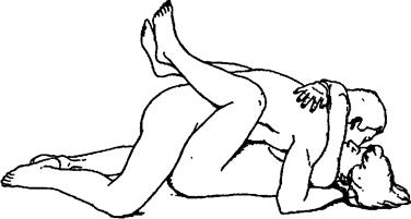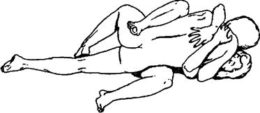 Рис. 25. Позиция «женщина сверху». Это положение также удобно, когда мужчина значительно больше женщины или стремится быстрее кончить или когда женщина находится на последних месяцах беременности (на ее растущий живот не оказывается давление). Мужчины пожилого возраста и мужчины с болезнями сердца считают, что это положение имеет большую ценность, поскольку оно не требует большого напряжения. Положение на боку Это положение требует относительно небольших усилий от обоих партнеров, и, таким образом, его хорошо применять на последних стадиях занятия любовью. Оно требует некоторого мастерства, поскольку нужно достигнуть и поддерживать определенную синхронизацию движений. Таким образом, оно хорошо для тех, кто знает друг друга достаточно близко. Проще всего для вас начать с положения сверху, а затем перекатиться на правый или левый бок в положение на боку. Кроме того, что это положение не требует больших усилий, оно имеет то преимущество, что партнеры находятся в положении лицом к лицу и контактируют друг с другом всем телом, что позволяет обмениваться большим количеством энергии. Однако оно может быть неудобным или сложным, пока вы не синхронизируете свои движения с движениями партнерши. В этом положении проникновения пениса неглубокие.