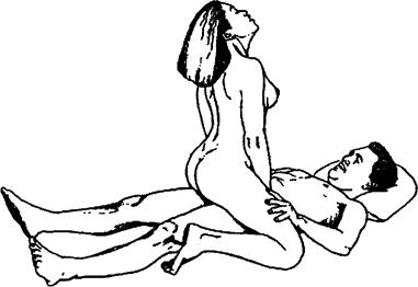 Рис. 24. Позиция «мужчина сверху». В этом положении ваша партнерша может двигать руками вдоль вашего позвоночника, чтобы помочь вам поднять энергию вверх к вашей голове. Также в этом положении многие части вашего тела — ноги, живот, грудь и т. п. — соприкасаются с ее, а вес вашей лобковой кости и груди поможет ей быстро прийти в состояние возбуждения. Это положение также позволит вам использовать техники толчков и ввинчивания пениса, чтобы удовлетворить вашу партнершу и удерживать контроль над своим возбуждением. Главным недостатком этого положения является то, ваши руки обычно заняты тем, что поддерживают ваше тело, а G-зона вашей партнерши не стимулируется, пока вы не измените угол наклона крестца и пениса. Вы можете обойти эту проблему, подкладывая подушечку под ее ягодицы, и таким образом ее таз отклонится назад. Она может также положить свои ноги на ваши плечи и руки, и это будет иметь тот же эффект, что и подушечка, и это также поможет вам проникнуть, значительно глубже. Поднимите ее ноги и проникните в нее глубже. Это особенно помогает, если ваша партнерша имеет относительно большое влагалище, а вы относительно небольшой пенис Помните, что, согласно даосской теории, мужчина подобен огню, а женщина подобна воде. Поскольку женщине требуется больше времени, чтобы «закипеть», то мужчине лучше начинать с положения сверху. Когда женщина пришла в состояние возбуждения и готова погасить его огонь (что приведет к его эякуляции), вы можете изменить свое положение на положение «женщина сверху». Такое положение позволит мужчине легче концентрировать внимание. Однако в этой позиции женщина должна остановиться, как только возбуждение мужчины дойдет до кульминационной точки. Женщина сверху В этом положении мужчина ложится на спину, а женщина сидит на нем, расставив ноги. Многие мужчины считают, что это самое простое положение, в котором они могут научиться контролировать свою эякуляцию, чтобы достигнуть многократного оргазма. Причиной этого является то, что вы в этом положении можете расслабить тазовые мышцы и сосредоточиться на степени возбуждения. Сила тяжести также помогает в контроле эякуляции, и мужчина может сконцентрировать свое внимание на поднятии энергии вверх по позвоночнику. Ваша партнерша в этом положении может направлять движения пениса в наиболее сенситивные участки ее влагалища, включая G-зону, вот почему в этом положении многие женщины способны испытывать оргазм много раз. Ваша партнерша может также удерживать головку вашего пениса в наиболее чувствительной части влагалища, находящейся приблизительно в двух дюймах от его входа. Для мужчин очень сложно находиться в районе этих двух дюймов, когда он наверху, поскольку он стремится погрузиться глубже в плотные области — что, конечно, заставит его закончить значительно быстрее. В этом положении ваша партнерша может делать вращательные движения для того, чтобы ваш пенис терся о стенки влагалища на любой глубине и в любом направлении. В этом положении вы можете также использовать пальцы, чтобы стимулировать ее клитор и помочь ей закончить. Другим преимуществом этого положения является то, что вы можете сосать или ласкать ее грудь. Согласно древней даосской теории, вы можете пить сексуальную энергию вашей партнерши с ее губ, влагалища и ее груди.