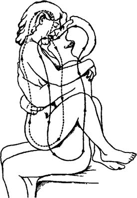 Рис. 28. Символ Дао. Согласно Су Ню: «Ян может оказывать свое действие только при наличии Инь, а Инь может «расти» только в присутствии Ян». В нас присутствует как Инь, так и Ля-энергия, Инь и Ян являются динамичными силами, которые могут взаимопереходить друг в друга. Многие люди на Западе думают, что мужское и женское — просто социальные, придуманные термины, обозначающие принадлежность к определенному полу. Однако согласно теории Дао, хотя все люди отличаются друг от друга, у мужчин обычно больше (мужской) Ян-энергии, а у женщин больше (женской) Инь-энергии. Даосы признают, что в мужчинах всегда присутствует некоторое количество женской энергии, а в женщинах — некоторое количество мужской, и отрицание этого является ложью. Эта идея изображена на символе Дао как небольшой круг, присутствующий на женской части и наоборот. В каждом содержится часть от другого. Хотя нам следует избегать бинарного сопоставления, мы должны знать о наших различиях, особенно в спальне или делая выводы. Например, Ян быстрее возбуждается, но и быстрее остывает. Инь медленнее возбуждается, но и медленнее остывает. Поскольку в мужчинах больше Ян-энергии, а в женщинах Инь, то они могут помогать уравновешиванию друг друга путем обмена энергиями во время занятий любовью. Идеально, когда оба партнера понимают, как происходит обмен энергиями, и в следующей главе мы объясним, что партнерша должна знать о каналах и циркуляции энергии в своем теле. Можно почувствовать обмен энергиями с партнершей, даже если она не знакома с системой Дао по сексу, но выполнить упражнение 13 без ее активного и понимающего участия сложно. Вы можете дать ей тем больше, чем легче и сильнее будет происходить обмен энергиями. Если вам сложно поднять ее энергию вверх, вам следует поджать свой пенис, анус и промежность. Слегка сжимая и расслабляя эти мускулы, вы сможете поднять энергию вверх. (Вы также можете ритмично, небольшими порциями поднимать ее энергию вверх с помощью коротких вдохов и выдохов, как было показано в упражнении Прохладный Ветерок; см. главу 3.) Через некоторое время вам удастся осуществлять контроль за вашей сексуальной энергией и вы не будете беспокоиться об эякуляции. Вы сможете посылать свою горячую энергию через пенис своей партнерше, а она должна представить себе, что посылает свою прохладную энергию через влагалище вашему пенису. Вы не получите ее Янь-энергию, не посылая ей своей Ян. Позволяя ей поглощать избыток вашей Ян-энергии, вы избегаете избыточного скопления энергии в ваших гениталиях и эякуляции. Если эякуляция произошла, то сложно заниматься обменом энергиями, потому что вы потеряли большую часть вашей. Помните об этом, это важно для процесса обмена. Вы, возможно, не сможете открыть все точки вдоль позвоночника во время первого обмена сексуальной энергией. Это нужно делать много раз — иногда это занимает много месяцев, — но в конце концов вы почувствуете теплый поток между вашими ртами и гениталиями. «Иногда, — рассказывает испытавший мультиоргазм мужчина, — когда мы страстно целовались, мы испытывали оргазм одновременно и чувствовали, как энергия идет прямо через нас. Мы направляли энергию через наши языки вниз по телу через мой пенис в ее влагалище, а затем поднимали ее по спине партнерши к нашим языкам. Это нельзя описать словами». Первое время может по