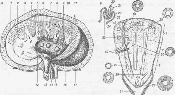 Анатомо-гистологическое строение почек (А – анатомическое, Б – гистологическое) 1 – мочеотделительная (корковая) зона; 2 – пограничная зона; 3 – мочеотводящая (мозговая) зона; 4 – мозговые лучи; 5 – фиброзная капсула; 6 – почечная чашечка; 7 – решетчатое поле; 8 – почечные сосочки; 9 – междолевые артерия и вена; 10 – междольковые артерия и вена; 11 – почечная пирамида; 12 – почечная лоханка; 13 – мочеточник; 14 – почечная вена; 15 – почечная артерия; 16 – серозная оболочка; 17 - жировая капсула; 18 – извитой каналец; 19 – капсула Шумлянского; 20 – приносящая артерия внутреннего слоя капсулы; 21 – выносящая артериола; 22 – полость капсулы Шумлянского; 23 – эпициты внутреннего слоя капсулы; 24 – наружный слой капсулы; 25 – прямой каналец (конечная часть); 26 – толстая часть петли Шумлянского; 27 – тонкая часть петли шумлянского; 28 – собирательная трубка; 29 – сосочковый каналец; 30 – мальпигиев клубочек; 31 – чашечка.