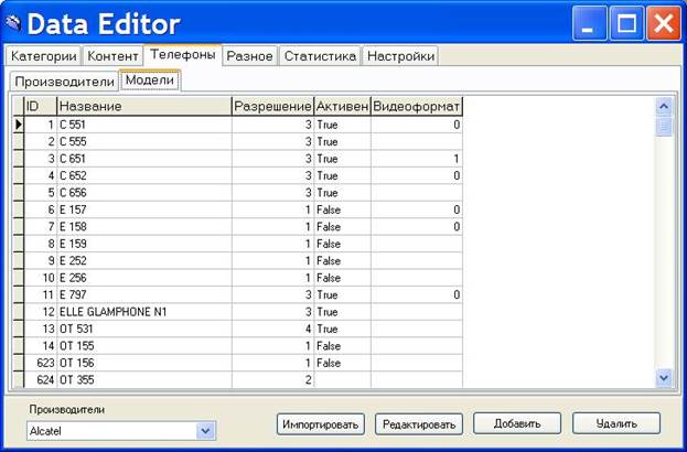 Содержит список поддерживамых моделей мобильных телефонов. Значение в поле «ID» задает внутренний номер модели телефона, указанного в столбце «Название» (Обратите внимание, что производитель указывается в специальном поле в левом нижнем углу). Значение «True» в графе «Активен» означает, что данная модель будет видна в списке доступных на фотокиоске, в противном случае она не будет отображаться. В поле «Разрешение» указано, какое разрешение графических и видео файлов поддерживает данная модель телефона. Обратите внимание: цифра 0 означает, что для данного телефона не выставлено поддерживаемое разрешение!