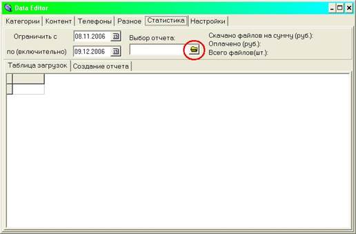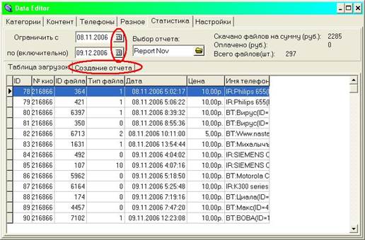 В таблице загрузки поле «ID» означает порядковый номер файла. В поле «№ киоска» записан серийный номер Вашего фотокиоска. В поле «ID файла» указан внутренний номер файла. Поле «Тип файла» содержит информацию о типе скачиваемого файла (мелодия, картинка, видеофайл, книга). В поле «Дата» указана дата скачивания файла в формате «число.месяц.год время_суток». В поле «Цена» записана стоимость закачки файла. Поле «Имя телефона» содержит информацию об идентификаторе телефона (указана пользователем!!), на который производилась закачка телефона.