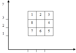 Рисунок 9. Целевое состояние для игры в «8» с осями координат Целевое состояние: [c(2,2), c(1,3), c(2,3), c(3,3), c(3,2), c(3,1), c(2,1), c (1,1), c(1,2)]. Разрешенные ходы: фишка 0 меняется местами с соседней фишкой. Соседняя фишка — фишка, находящаяся на расстоянии равном 1. Общее расстояние D=DX+DY, где DX и DY — расстояния по горизонтали и вертикали. Опишем предикат dist(F1,F2,D), вычисляющий расстояние по координатам двух фишек. dist(c(X,Y),c(X1,Y1),D):- dist1(X,X1,DX), dist1(Y,Y1,DY), D=DX+DY. dist1(Z,Z1,DZ):- DZ=abs(Z-Z1). Стоимость каждого хода положим равной 1. При обмене фишки «0» с какой-то фишкой «j» (при условии, что они находятся на расстоянии 1) происходит обмен координатами фишек «0» и «j» (рис. 10).