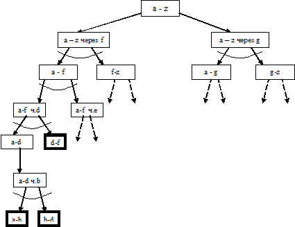 Рисунок 16. Карта дорог для задачи о поиске пути от пункта a до пункта z Разумеется, эту задачу проще решить с помощью обычного пространства состояний, причем пространство состояний в точности соответствовало бы карте. Попробуем представить ее с помощью разложимой системы продукций. Нашей исходной задачей, или начальной вершиной, является задача «найти путь от a до z» так как f и g — мосты, то попасть из a в z можно либо через пункт f, либо через пункт g. Следовательно, «найти путь из a в z» вершина типа «ИЛИ». Задачи «найти путь от a до z через f» и «найти путь от a до z через g» разбиваются на две подзадачи: «путь от a до моста» и «путь от моста до z». Следовательно, эти задачи являются вершины типа «И». Дальнейшее разбиение можно построить, вводя дополнительные промежуточные пункты. Изобразим часть И-ИЛИ графа на рис. 17: