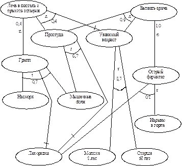 В реальных экспертных системах заключения отделены от базы посылок большим числом промежуточных шагов. Такие рассуждения называются многоступенчатыми. Чтобы представить себе, что же такое многоступенчатое рассуждение, допустим, что вы заболели. У вас простуда, вирусная инфекция или грипп, и вы хотели бы знать, что следует предпринять. Приведем несколько правил, которыми можно руководствоваться в подобных случаях. Для каждого правила указан его коэффициент определенности. Если у вас грипп, и вы находитесь в уязвимом возрасте, то вызовите врача. ct(импликация) =0,9 Если у вас острый фарингит, то вызовите врача ct(импликация) = 1,0 Если у вас простуда, то ложитесь в постель и примите аспирин. сt(импликация)=0,4 Если у вас грипп, и вы не находитесь в уязвимом возрасте, то ложитесь в постель и примите аспирин. сt(импликация) = 0,4 Если у вас лихорадка и болят мышцы, то это грипп. сt(импликация) = 0,7 Если у вас насморк, мышечные боли и нет лихорадки, то это простуда. ct(импликация)=0,7 Если у вас в горле нарывы и есть лихорадка, то это острый фарингит. ct (импликация)=0,8 Если вам меньше 8 или больше 60 лет, то вы находитесь в уязвимом возрасте. сt(импликация) = 0,7 Данная форма представления базы знаний удобна для компьютера, но не для человека. Для обсуждения многоступенчатого рассуждения правила удобно преобразовывать в другую форму, позволяющую более отчетливо представить связи между ними. Любая база знаний имеет графическое отображение, называемое сетью вывода и представляет собой ни что иное, как И-ИЛИ граф (рис. 36). Сеть вывода и множество взаимосвязанных импликаций — это одно и то же. Обе формы содержат одинаковый объем информации. В правилах, составляющих сеть вывода, могут быть и позитивные, и негативные утверждения. Так, в рассмотренном выше медицинском примере нам встретились две фразы: «есть лихорадка» и «нет лихорадки». Поскольку здесь речь идет об одном и том же, эти фразы удобно зафиксировать в одной вершине сети вывода. Для правила, где эта фраза появляется в негативной форме, связь отмечается перечеркивающей полосой, проходящей через вершину «лихорадка». Там, где она появляется в позитивной форме, связь имеет обычный вид. Сплошная дуга изображает «И»-правило, пунктирная — «ИЛИ»-правило, символы n и r над (под) дугой соответственно необратимые и обратимые правила. Коэффициент определенности, указанный рядом с вершиной, относится к позитивной форме утверждения. Такие биполярные графы удобны тем, что для получения коэффициента определенности негативной формы достаточно просто поменять знак на противоположный.