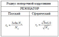 Модуль степени пространственной когерентности является квазипериодической функцией. В реальных случаях база резонатора L много больше характерного размера зеркал a (L >> a), а число Френеля (ka2 / 2πL) ≥1. С учетом этого условия, радиус корреляции rk ≈ a / N⊥. Таким образом, для многомодовых лазерных пучков, возбуждаемых в плоскопараллельном резонаторе с прямоугольными зеркалами радиус корреляции обратно пропорционален числу возбуждаемых поперечных мод N⊥. Но это соотношение можно использовать лишь для грубых оценок. Отличия от эксперимента могут быть связаны с неоднородностями активной среды, неравномерностью распределения интенсивностей по модам. Приближенный расчет радиуса корреляции лазерного поля со статистически независимыми модами можно выполнить и другим способом - оценивая средний размер неоднородности по возбуждаемым модам, который в соответствии с выражением для распределения амплитуды моды по половинному уровню можно оценить как rm ≈ 2a ⁄ m. Для плоского резонатора получим rk ≈ 2a ln N⊥/N⊥. Таким образом, данное выражение, которое получается исходя из поперечной неоднородности лазерного пучка, дает практически такую же зависимость, что и предыдущее. При наличии неоднородностей внутри резонатора даже для плоскопараллельного резонатора более адекватной оказывается модель сферического резонатора. Аналогичным способом, исходя из масштаба радиальных неоднородностей можно найти радиус корреляции для сферического резонатора